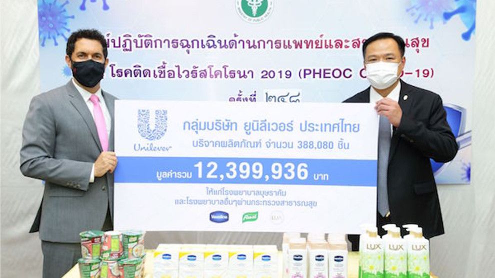 บริษัทยูนิลีเวอร์ ประเทศไทย บริจาคสินค้าอุปโภคบริโภค มูลค่ากว่า 12 ล้านบาท ให้กระทรวงสาธารณสุข เพื่อส่งมอบให้แก่บุคลากรทางการแพทย์ที่ทำงานในโรงพยาบาลสนามในกรุงเทพมหานครและต่างจังหวัด เพื่อต่อสู้กับการแพร่ระบาดของโควิด-19