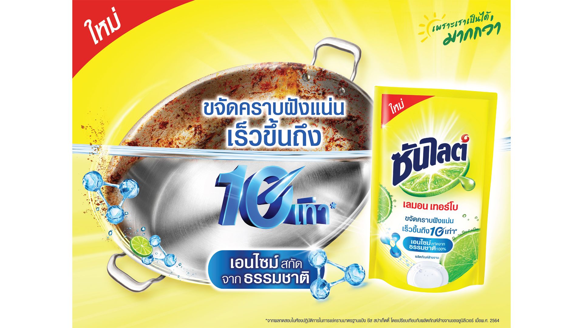 นางสาววรพักตร์ บรรเลงจิต รองประธานกรรมการบริหารการตลาดผลิตภัณฑ์ในครัวเรือน กลุ่มบริษัท ยูนิลีเวอร์ในประเทศไทย มาเลเซีย และสิงคโปร์ เปิดเผยว่า จากการวิเคราะห์และสำรวจความเห็นผู้บริโภคพบว่าคราบฝังแน่นเป็นหนึ่งในคราบที่ทำความสะอาดยากที่สุดในการล้างจาน ทำให้ซันไลต์คิดค้นผลิตภัณฑ์ล้างจานสูตรใหม่ “ซันไลต์ เลมอน เทอร์โบ” ที่สามารถขจัดคราบฝังแน่นเร็วขึ้นถึง 10 เท่า2พร้อมเอนไซม์สกัดจากธรรมชาติ 100% ที่สามารถย่อยสลายได้ตามธรรมชาติและรักษ์โลกกว่าเดิมด้วยการลดการใช้สารทำความสะอาดที่มาจากปิโตรเคมีได้ถึง 5,000 ตันต่อปี3ยิ่งไปกว่านั้นยูนิลีเวอร์มีความมุ่งมั่นที่จะพัฒนาผลิตภัณฑ์ที่มีบรรจุภัณฑ์ที่สามารถนำมารีไซเคิลได้ 100% ภายในปี 2568 และผลิตภัณฑ์ที่สามารถย่อยสลายตามธรรมชาติได้ 100% ภายในปี 2573